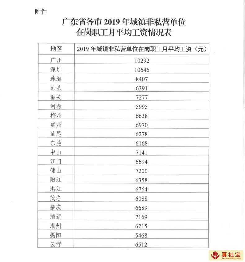 根据《人力资源社会保障部 财政部 税务总局关于延长阶段性减免企业社会保险费政策实施期限等问题的通知》(人社部发〔2020〕49号)第三条规定,个人缴费基数下限不调整,继续按2019社保年度标准执行。附件:广东省各市2019年城镇非私营单位在岗职工月平均工资情况表